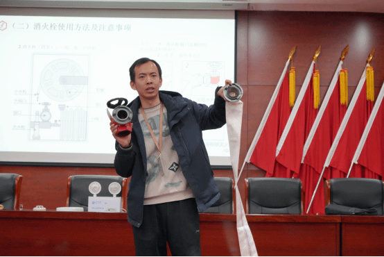 理论讲解结束后,讲座进入实操教学环节。梁老师现场示范了灭火器、消火栓等校园常用消防器材的规范使用方法,细致拆解灭火器 “提、拔、握、压” 的操作步骤,清晰讲解消火栓各部件功能及使用注意事项,并邀请师生现场上手操作,一对一指导纠正不规范动作,让大家在亲身体验中掌握实操技能,真正实现消防理论入脑入心、实操技能学以致用。