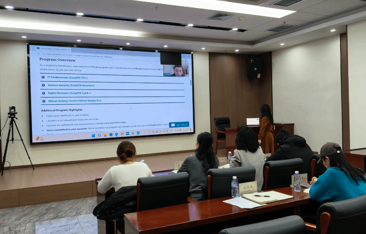 会上美国多米尼克大学高轶军教授就该校网络空间安全证书认证体系、行业适配标准等进行了深入阐释,并分享了证书体系与人才培养方案的融合逻辑以及国际办学经验。双方结合我校学科发展实际,就证书标准互鉴、合作路径拓展等关键问题,展开深度探讨,为后续在相关领域的务实合作积累了宝贵思路。高轶军教授后续也将到我校进行实地考察交流,切实推动双方合作事宜落地见效。