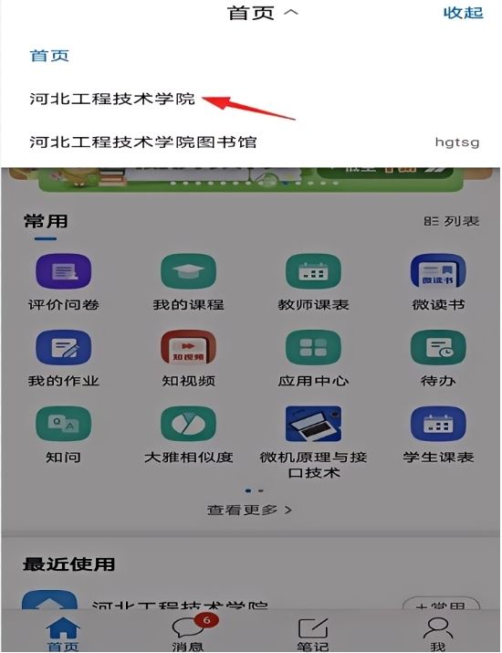 1.打开超星学习通客户端,进入首页后,选择下拉菜单中的“河北工程技术学院”。