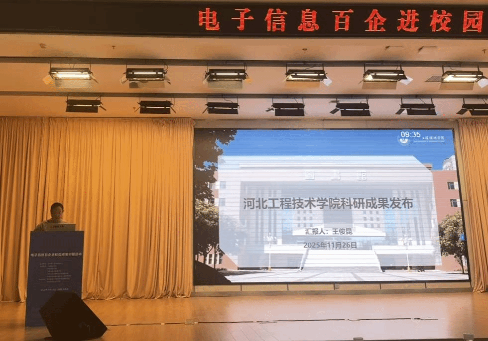 为深入贯彻河北省关于电子信息产业高质量发展的战略部署,促进产学研深度融合与成果转化,推动产业人才培育与技术创新协同发展,11月26日,由河北省工业和信息化厅主办的以“深化产教融合,促进成果转化”为主题的“电子信息百企进校园成果对接活动”在河北科技大学图书馆报告厅隆重举行。河北工程技术学院科研与产教融合处王俊昆、周玉妹两位同志应邀参会,进行成果发布,与省内外 200 余名高校院所、重点企业、园区及金融机构代表共话产学研合作,共探产业创新机遇。