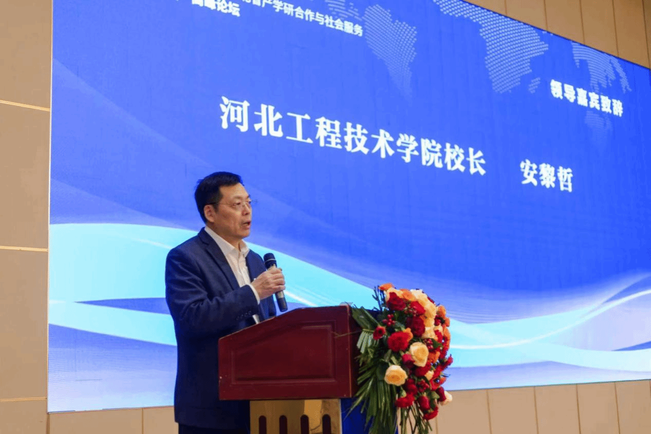 校长安黎哲致辞并宣布论坛开幕。他强调,推动产学研深度融合、实现协同育人,是国家创新驱动发展战略的关键,也是应用型高校的核心使命。他介绍了学校“立足河北、服务京津冀、辐射全国”的办学定位,以及建设高水平应用型大学、培养“兴业英才”的战略目标。他还表示,学校将深度融入河北省八大主导产业体系、石家庄五大千亿级产业集群及107个县域特色产业集群建设,整合校内资源,联合政企,筹建县域特色产业产教融合联合体,搭建开放性行业生态与协同创新平台,为河北省产业升级、高质量发展及新质生产力发展提供服务支撑。