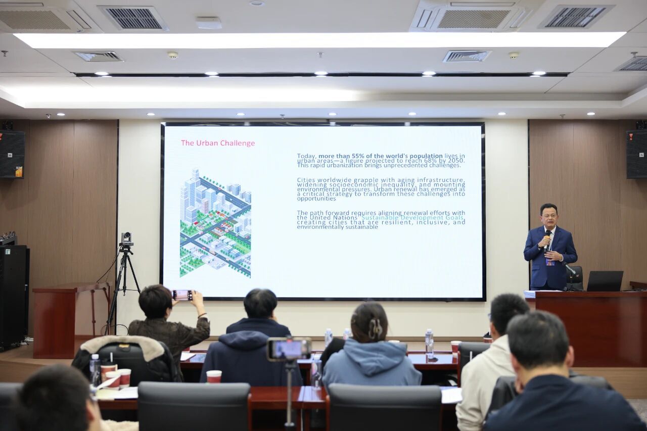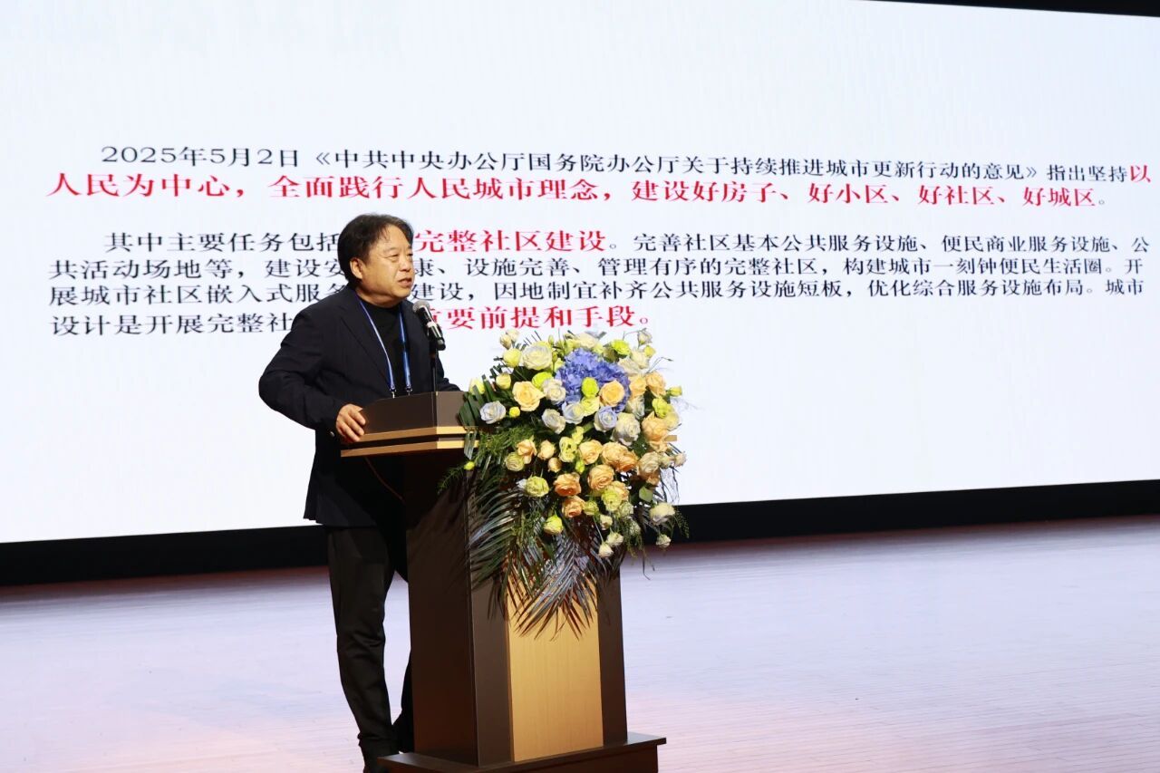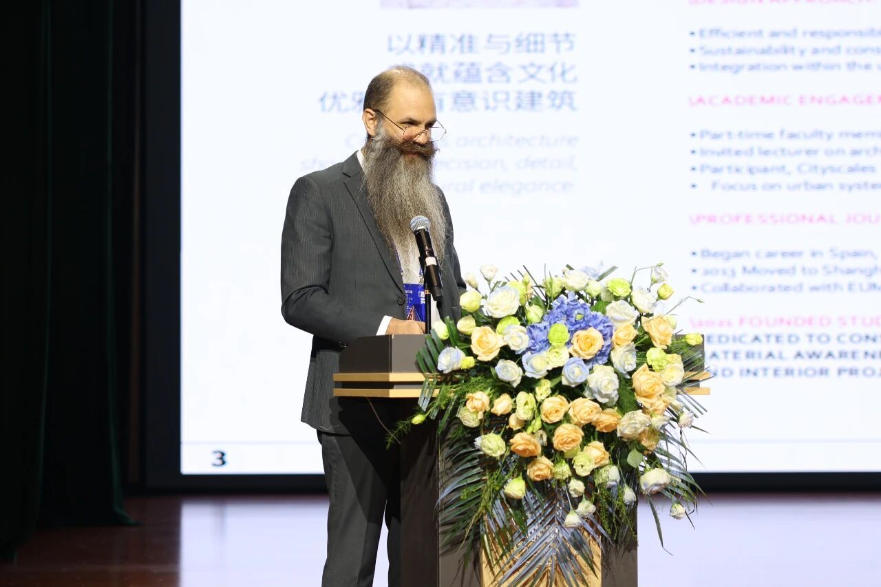 在主旨报告环节,四位国内外知名专家带来了精彩纷呈的学术分享。河北省建筑设计研究院有限责任公司董事长、总建筑师、河北省建筑大师郭卫兵以《城市视角下的城市更新》为题,分享了本土实践的深刻思考;意大利建筑设计公司创始人马里奥·卡迪那斯在《建筑与环境:迈向再生设计》中,引入了前沿的国际设计理念;河北工程技术学院副校长武勇教授结合本校实践,作了《城市更新视角下的校园更新》的专题分享;意大利Baoblab创始人吉罗拉莫·巴尔巴恰以《超越区规划:为幸福和快乐设计城市,城市共存与情感可持续性的新逻辑》为题,探讨了城市规划中的人文关怀与情感维度。各位嘉宾的分享内容详实、案例生动、观点新颖,辅以精美的视觉材料,为与会者带来了强烈的思想碰撞与艺术震撼。